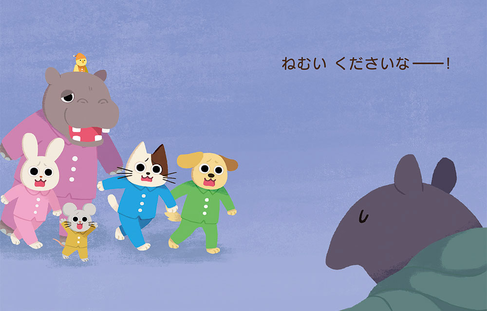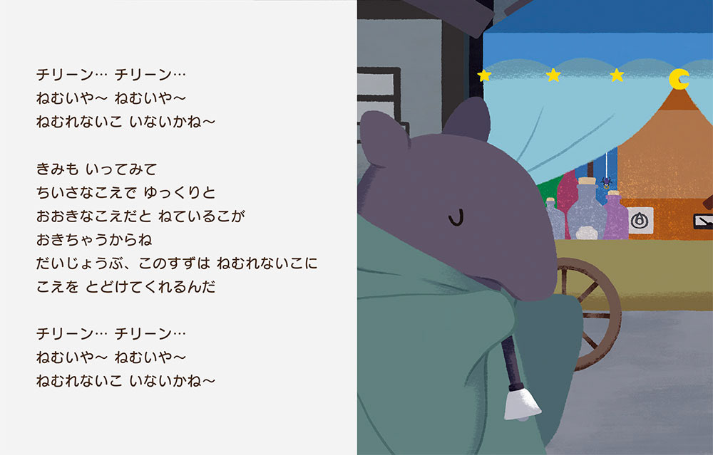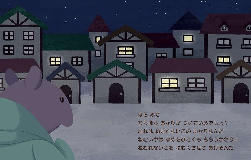 静かな夜の町にねむいやさんがやってきました。